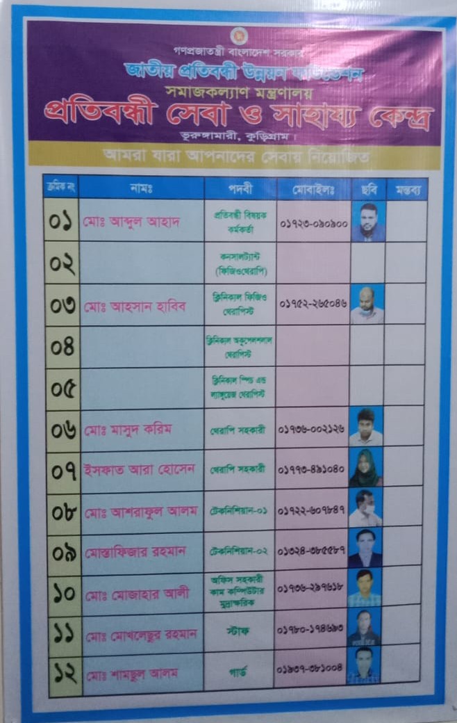 প্রতিবন্ধী সেবা ও সাহায্য কেন্দ্র,ভূরুঙ্গামারী,কুড়িগ্রাম অফিসে প্রতিবন্ধী বিষয়ক কর্মকর্তা এর অধীনে ০১ জন কনসালট্যান্ট (ফিজিওথেরাপি)